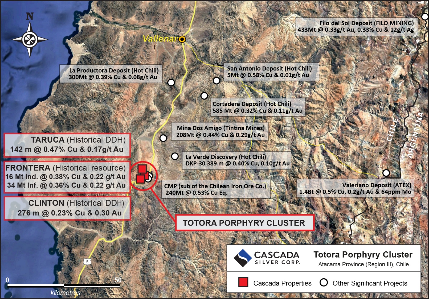 Toronto, Ontario, November 20, 2025 - Cascada Silver Corp. (CSE:CSS; OTCQB:CSSCF) ("Cascada") is pleased to announce that it has signed non-binding memorandum of understandings (“MOUs”) for the acquisition of three advanced copper-gold properties: the Frontera; Clinton; and Taruca properties (the “Properties”). The Properties overlie multiple copper-gold porphyries comprising a portion of the Totora Cu/Au Porphyry Cluster located 60 kilometres south of Vallenar in Chile’s Region III (see Figures 1 and 2) near the Pan American Highway (HWY 5) and high voltage power lines.