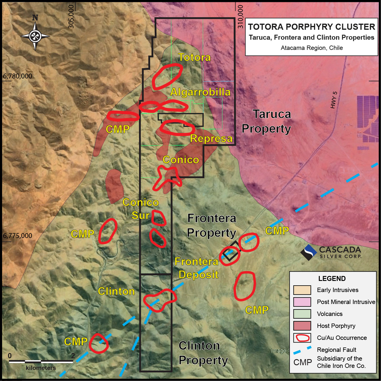“These MOUs provide Cascada with a strategic foothold in one of Chile’s prospective copper-gold porphyry belts. The Properties collectively host multiple mineralized systems, including the near-surface Frontera deposit and two advanced porphyry prospects on Taruca and Clinton. Our immediate objective is to convert the historical work into current resource estimates and define the scale potential across the Totora Porphyry Cluster. Our goal is to build a multi-deposit copper-gold camp with total economically viable resources exceeding 250 million tonnes.